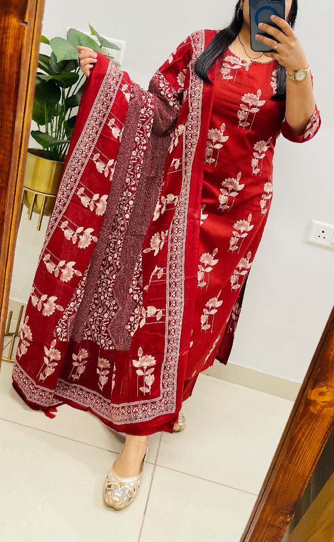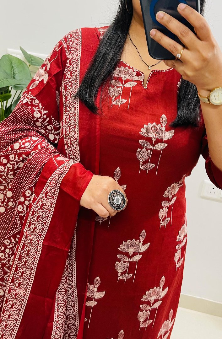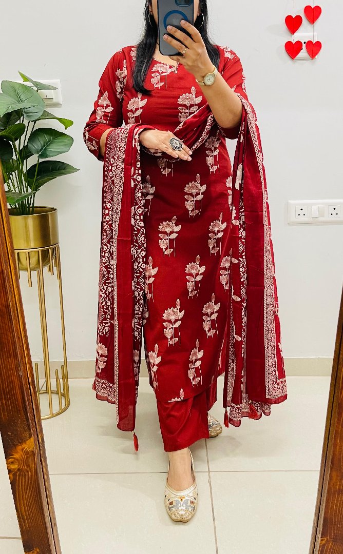 Ajrakh Cotton Designer Suit in Kurta Pant dupatta set with detailing embroidery work on the yoke & Tussels attached on all 4 corners of dupatta..
