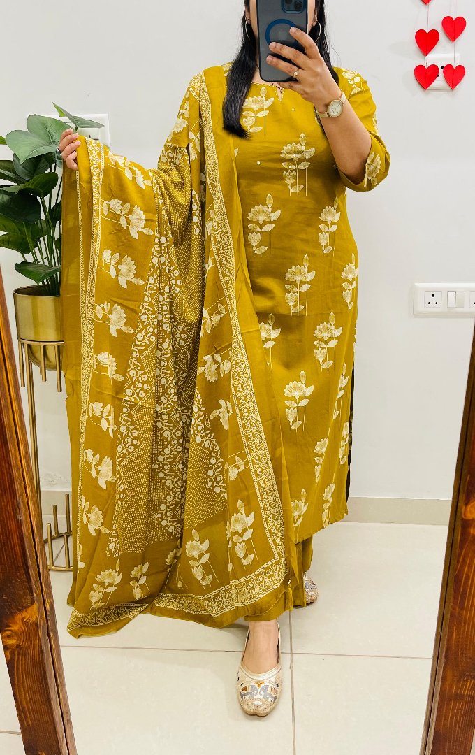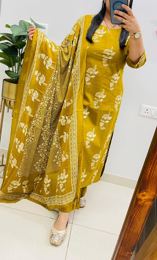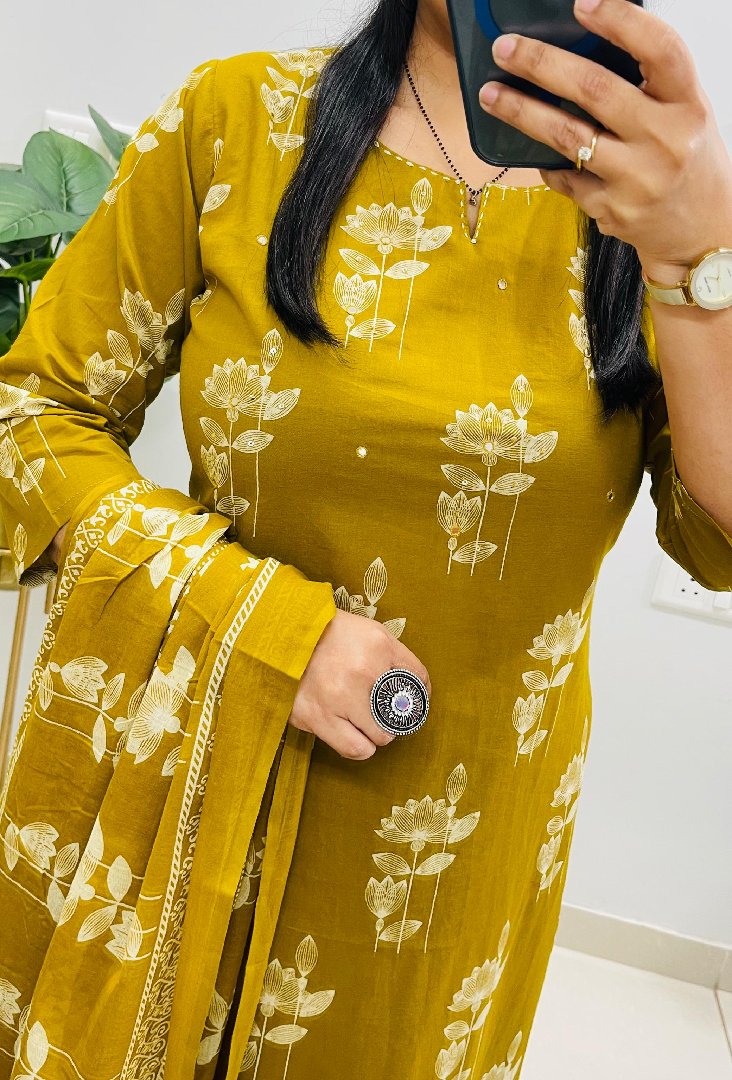 Ajrakh Cotton Designer Suit in Kurta Pant dupatta set with detailing embroidery work on the yoke & Tussels attached on all 4 corners of dupatta..