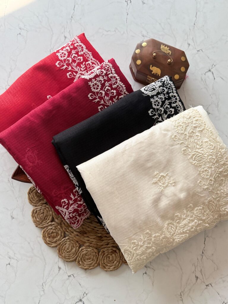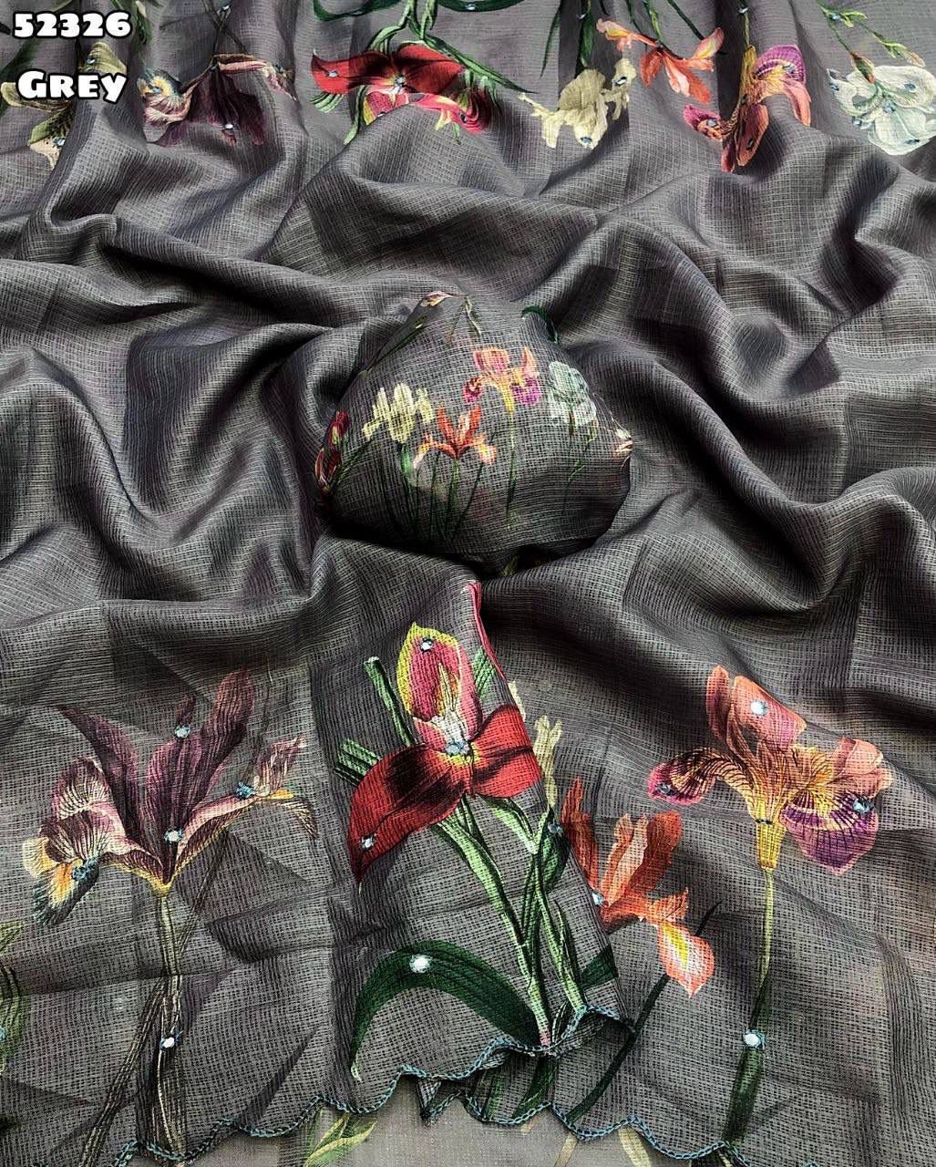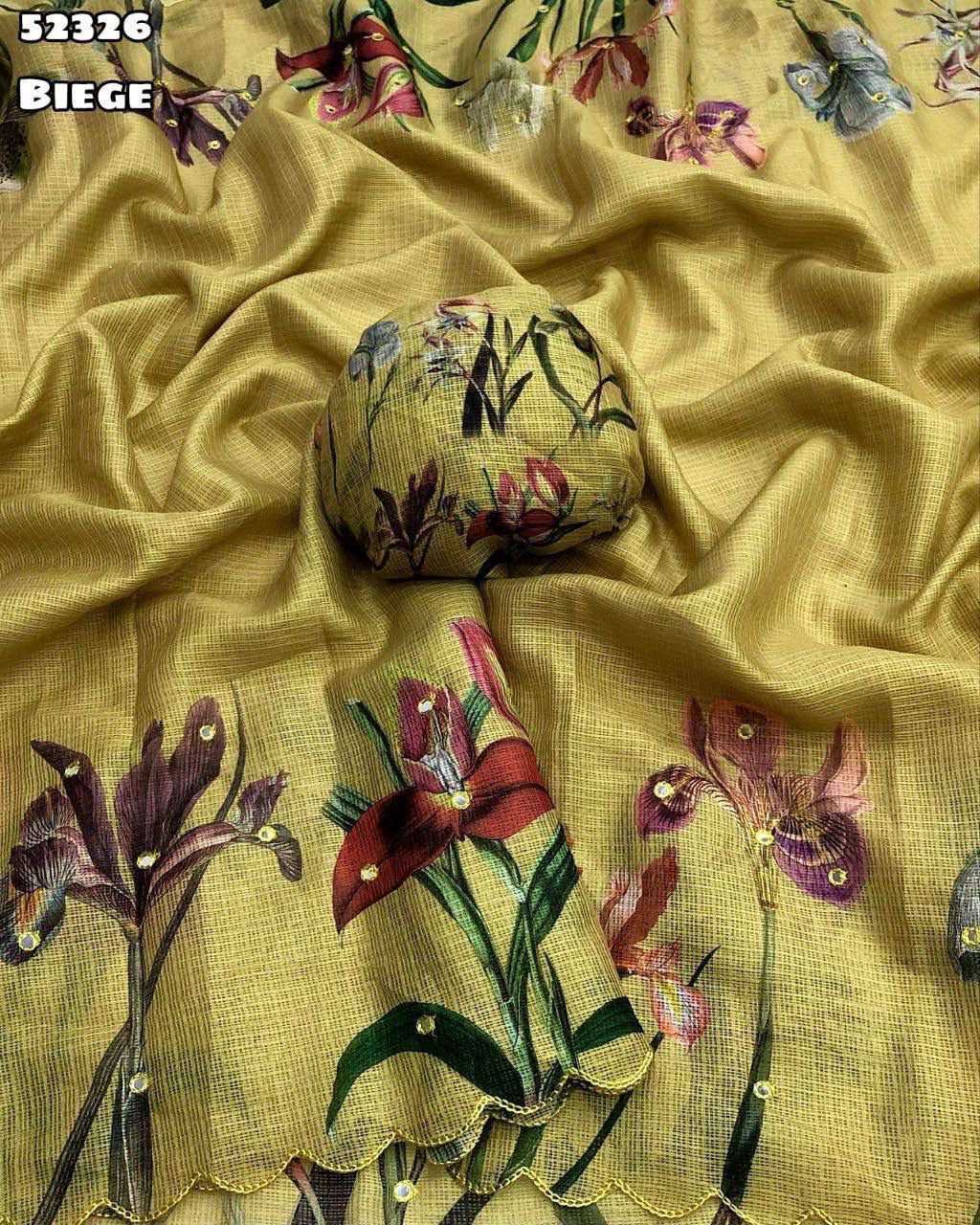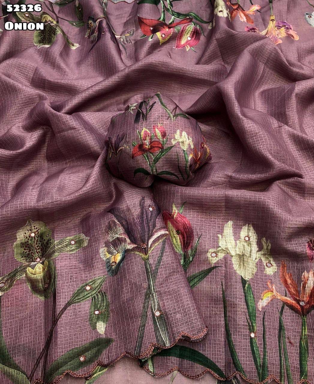 Fabric – Soft kota chex with floral digital print with embroidery foil mirror with scalloped cutwork border