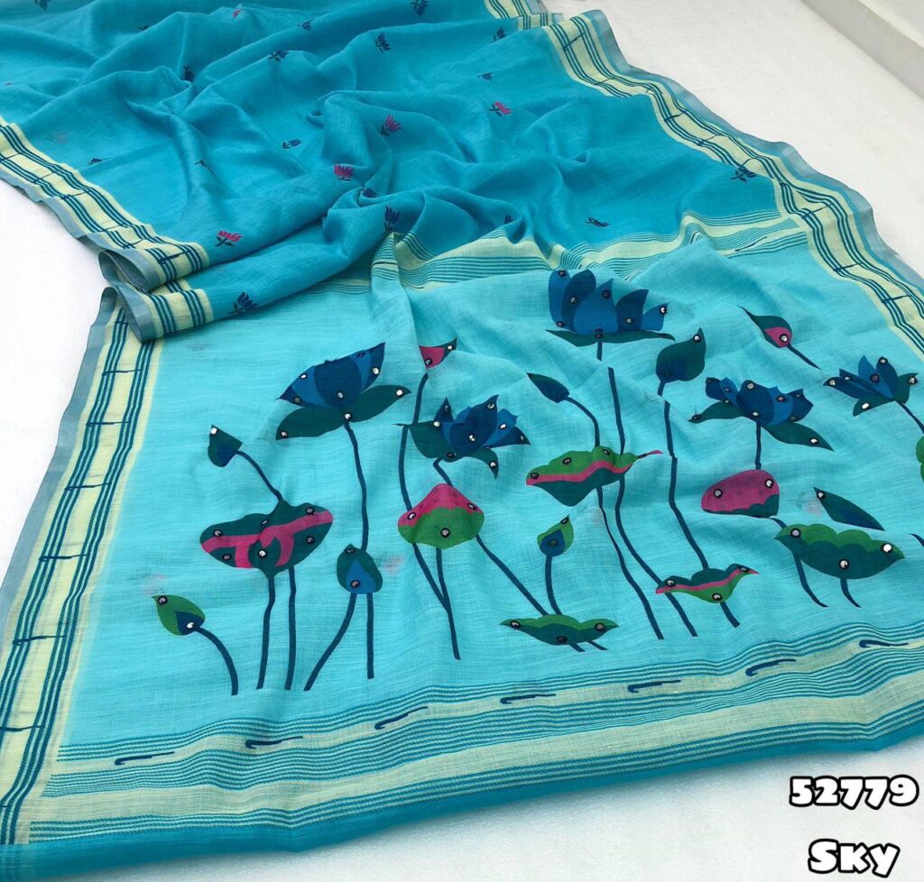 Fabric – Launching New Soft linen floral digital print embroidery work arka border fancy saree