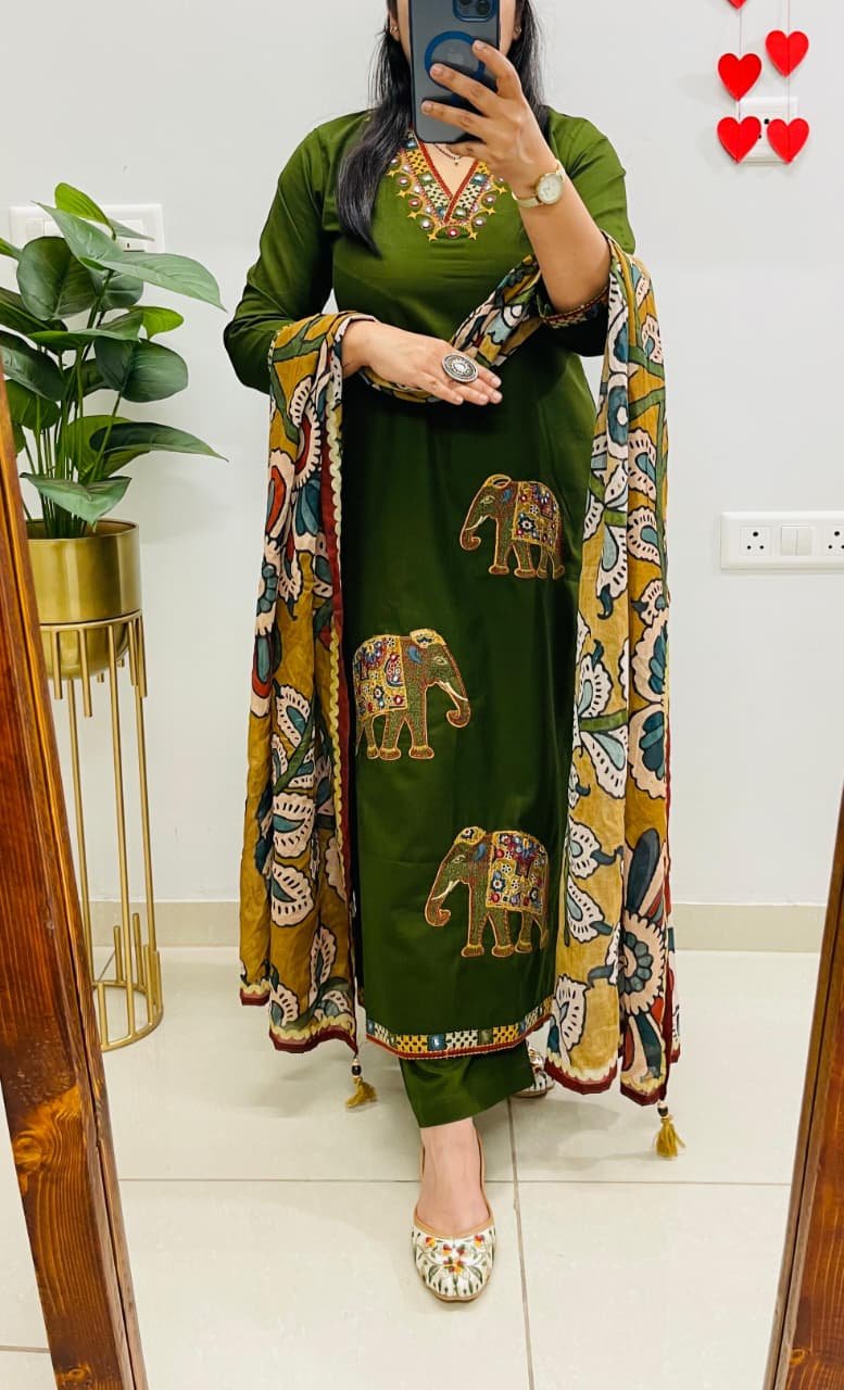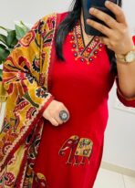Very Fine Dhabu Cotton Suit with Straight Kurti having Heavy Elephant Handwork Embroidery on the kurta with Handwork Detailing Embroidery on the yoke with Embroided Lace work on the sleeves & Kurta ….with dhabu Cotton Pant…