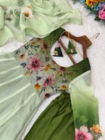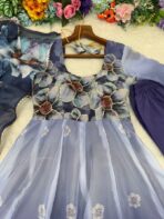– Gown: Organza Fabric Floral printed , 50″ length, 3m flair