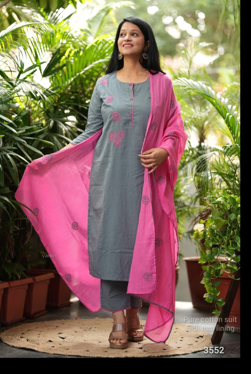 Fabric pure cotton self weaving embroidery suit kurta front show button style Paired with same cotton pant and pur kota doria full size duppata with all over embroidery 🪡 and crochet lace work.