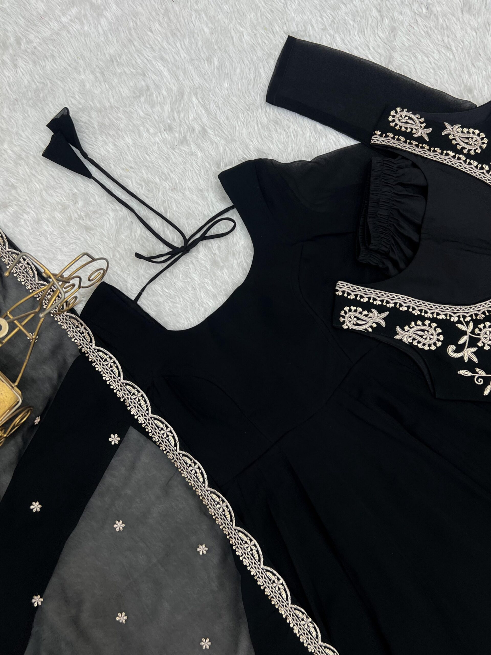 *YOKE FANCY WORK KOTI,16 KALI GOWN,FULL CHURIDAR SLEEVES ,SIDE ZIPPER,FANCY WORK DUPPTA,BACKSIDE FANCY TASSELS*