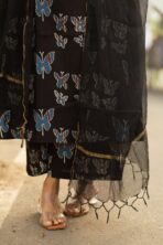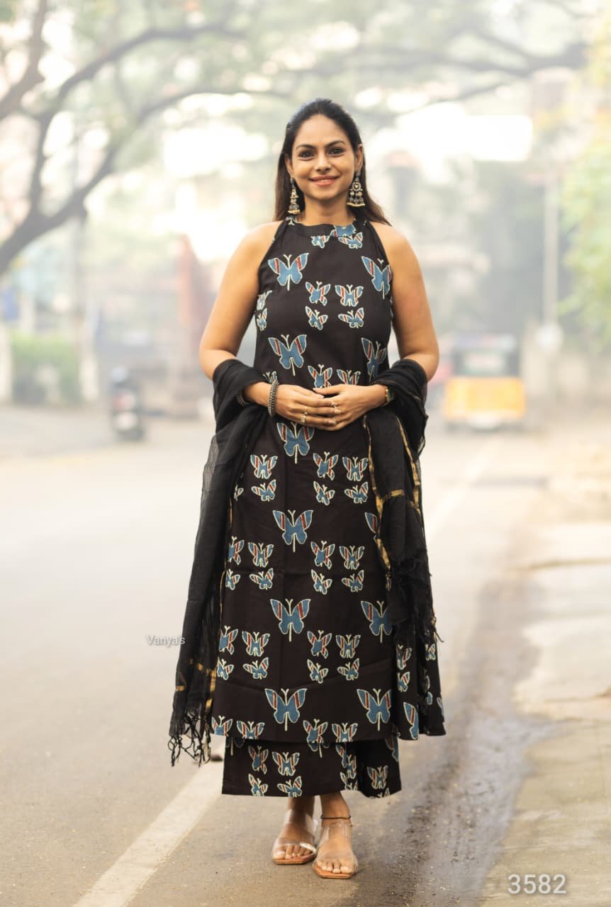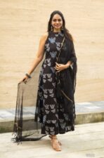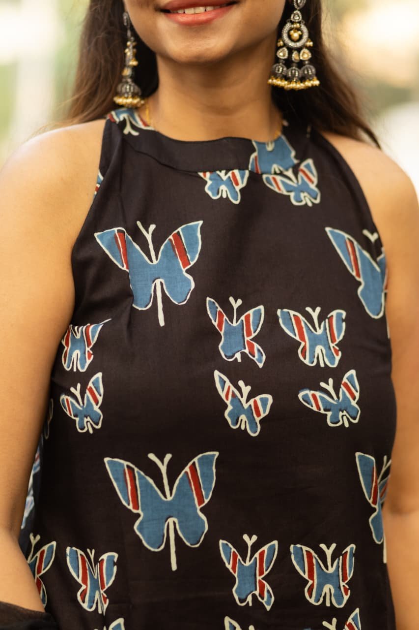 Halter neck with side pocket flaired A line kurta with cotton printed full flared plazo and matching black kota doria zari border duppata.