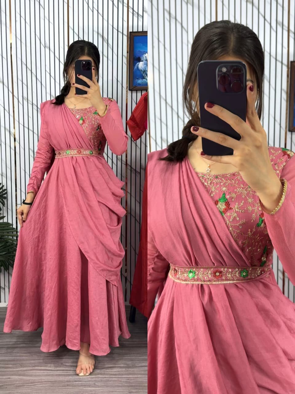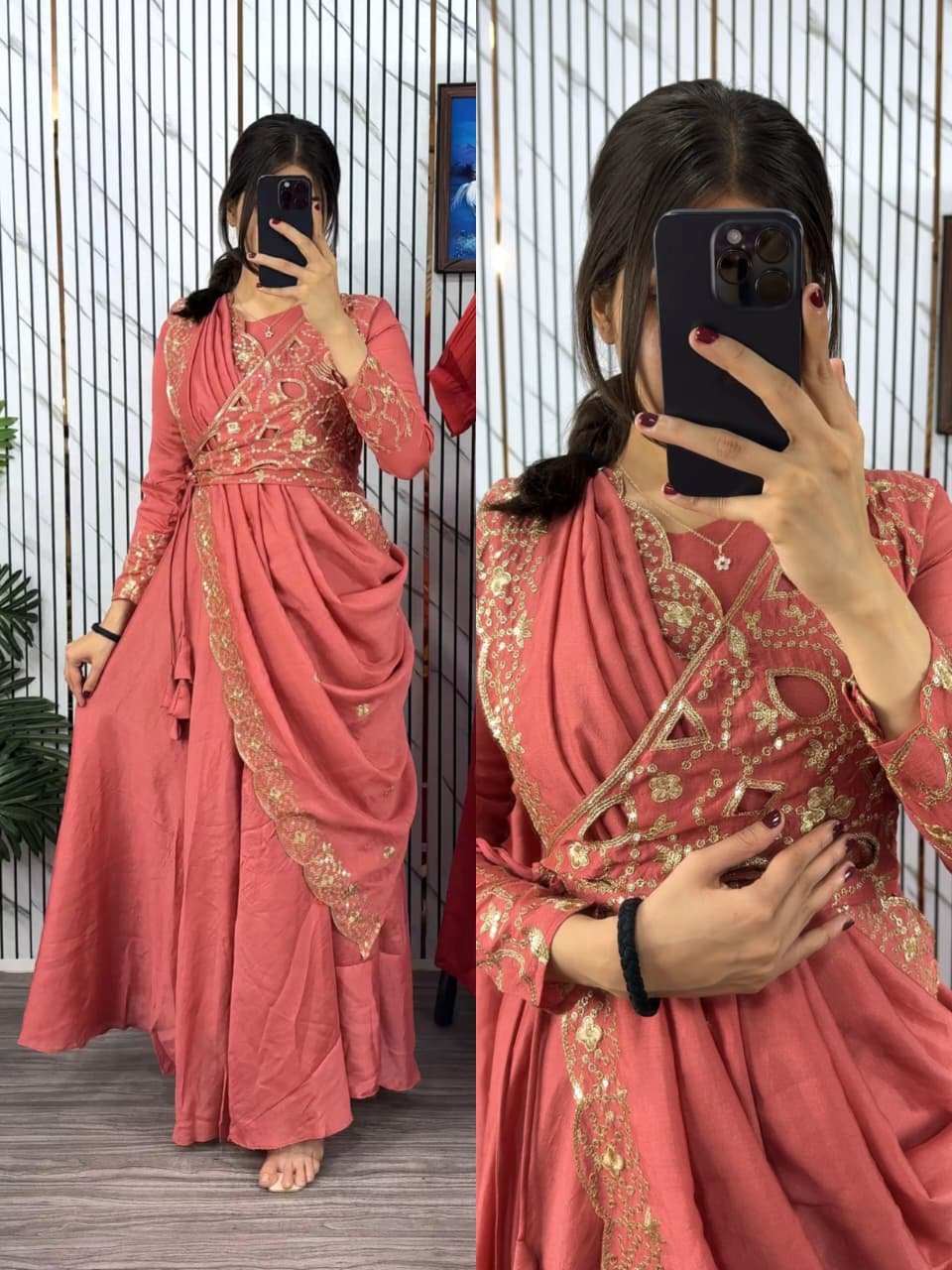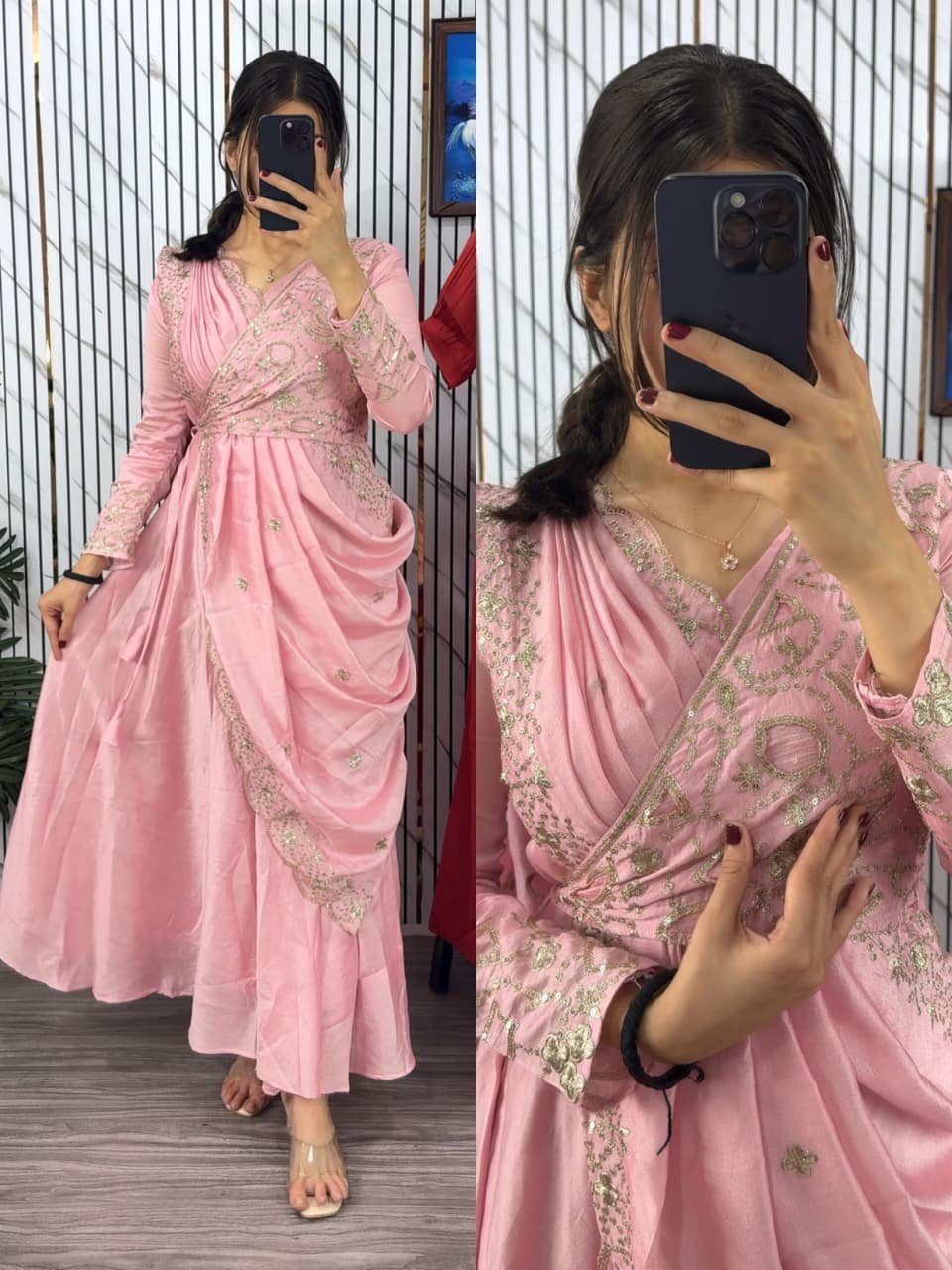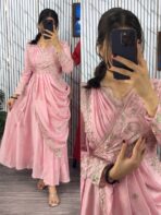 It is a floor-length gown with a fitted bodice The silhouette is classic and elegant.The yok portion is heavily embellished with gold thread embroidery. It features floral and bird-inspired patterns, incorporating intricate cutwork (jali) details.The accompanying dupatta has a striking scalloped edge with heavy golden embroidery that matches the bodice of the dress.