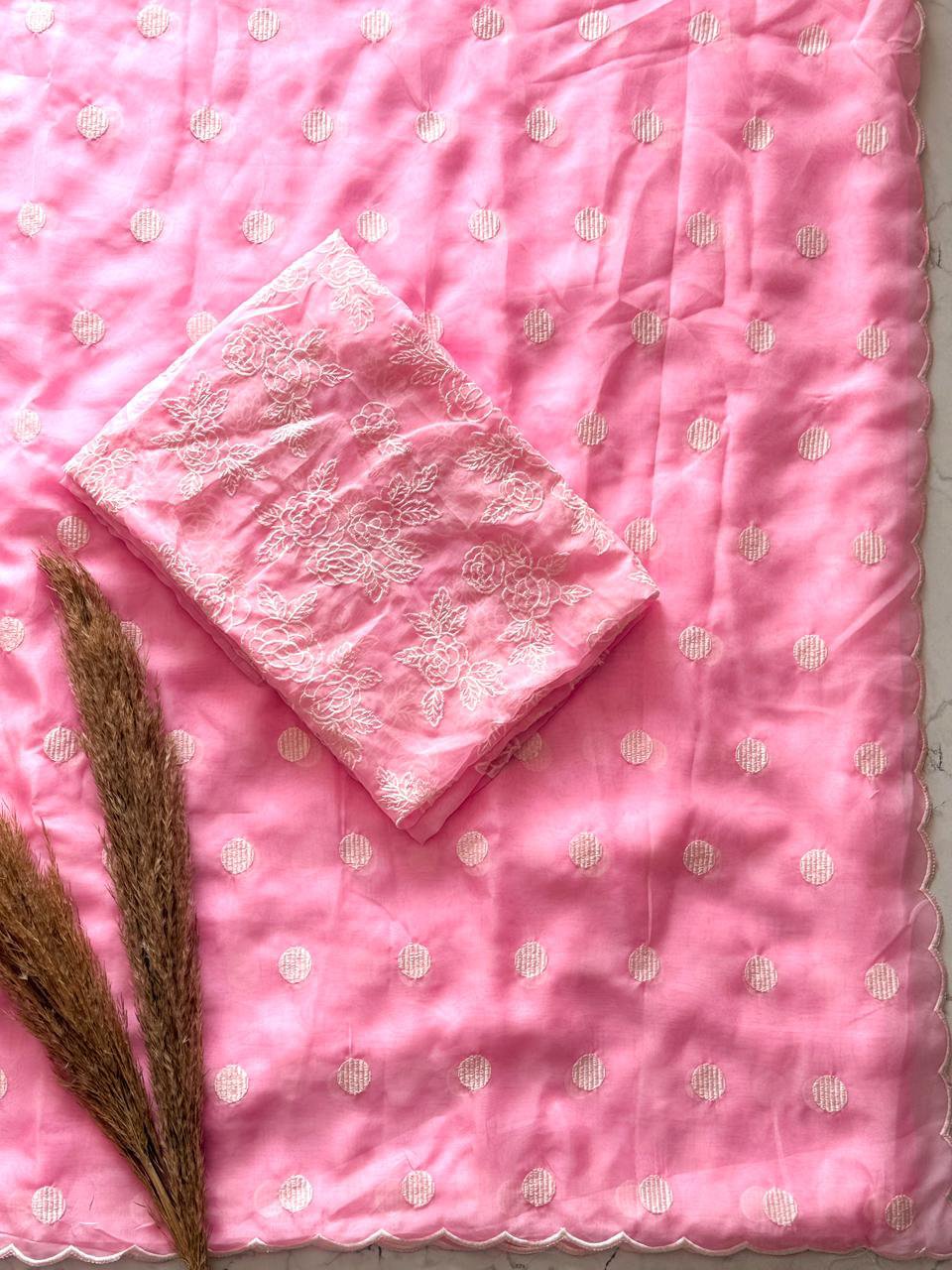 Primium Tebby Orgenza With Polka Dot Thread Work And Scalp Border