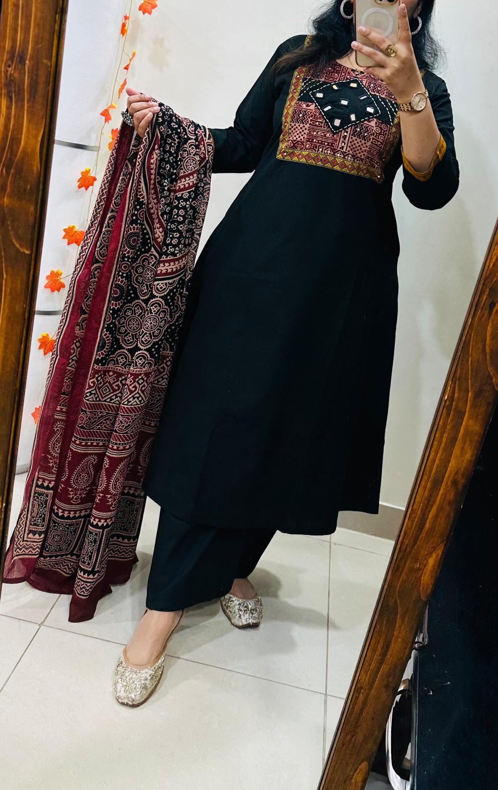 Beautiful kurti pant dupatta set in *Premium Dhabu Cotton* with beautiful azrakh applique with sequin detailing and real mirror work in yoke with cotton azrakh dupatta