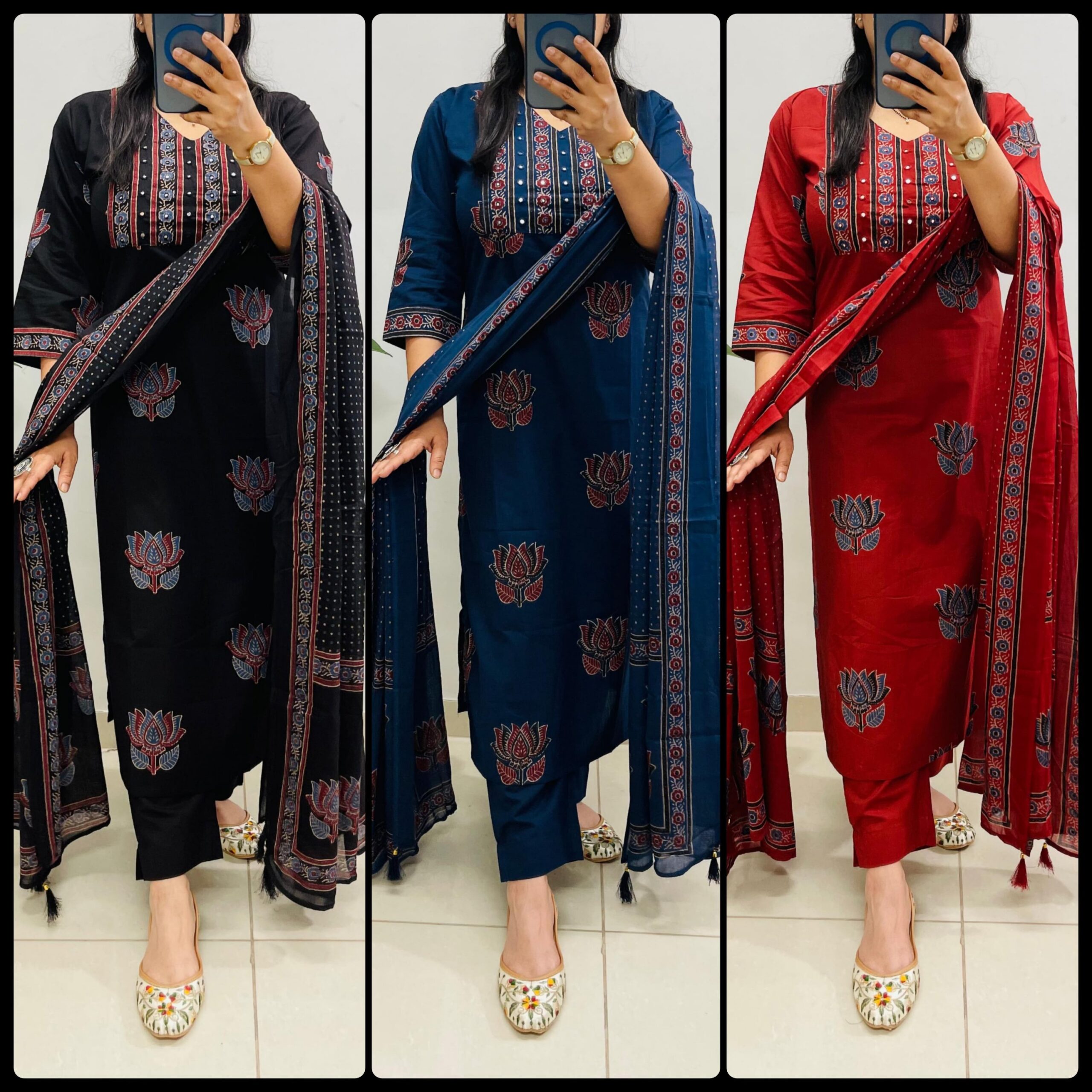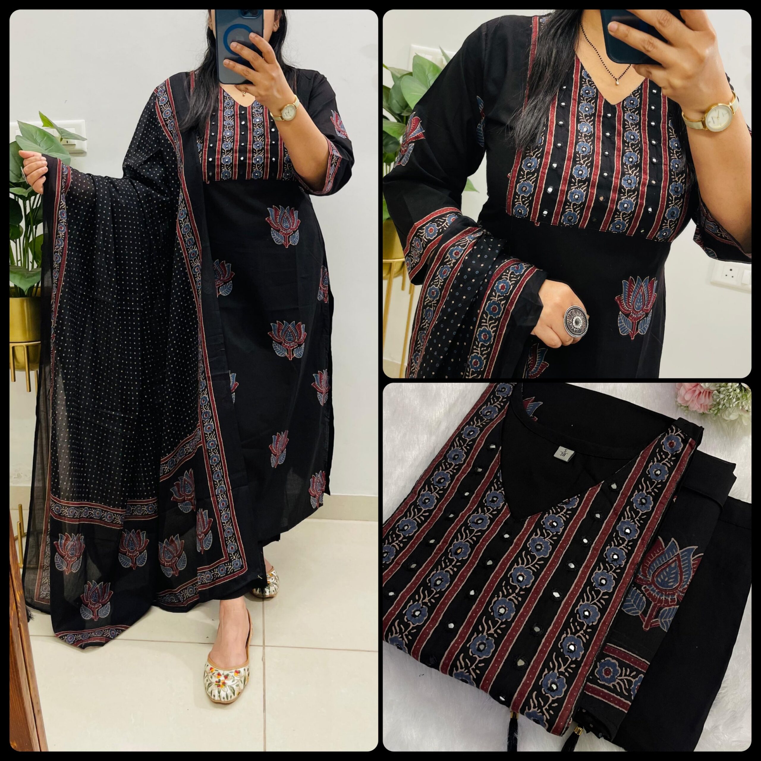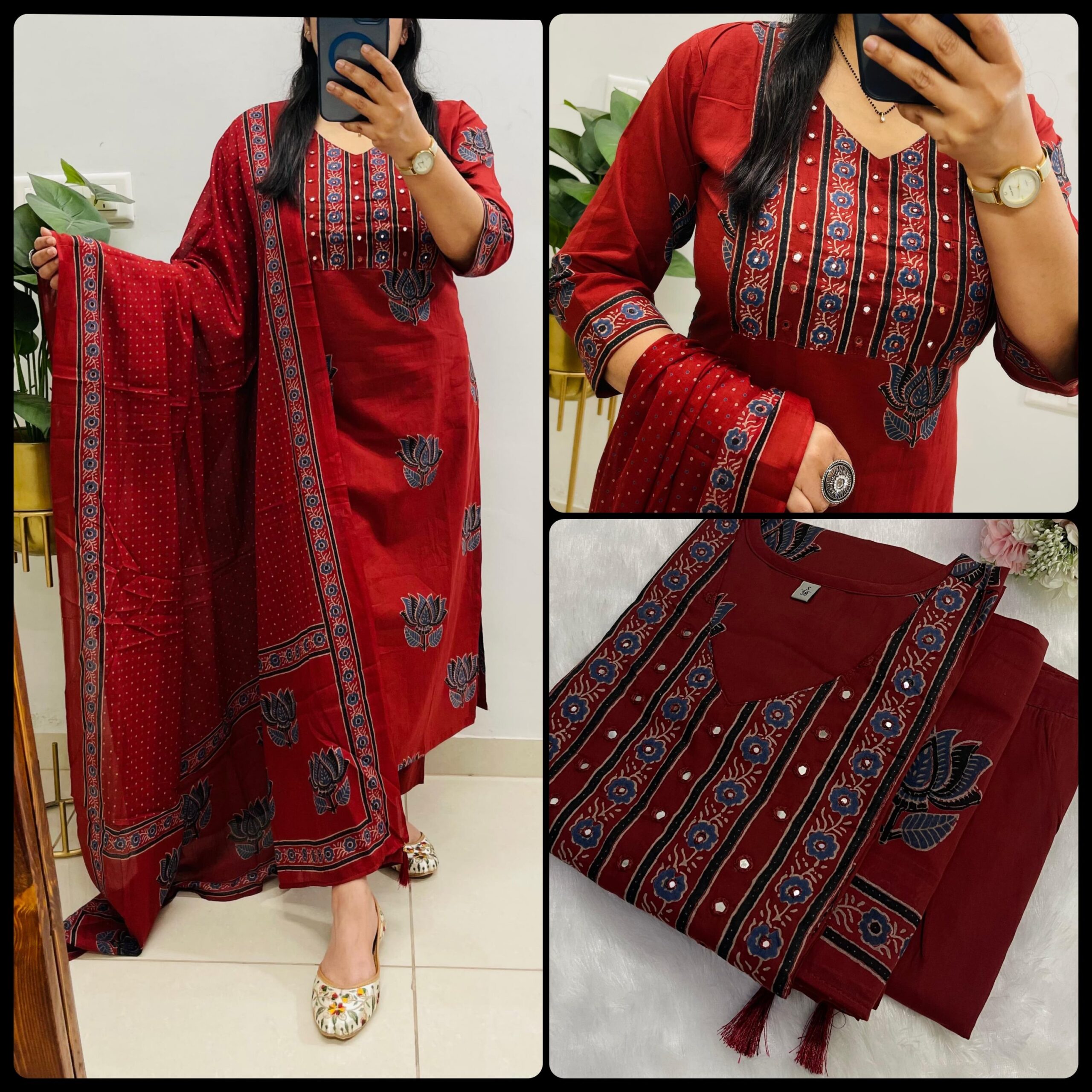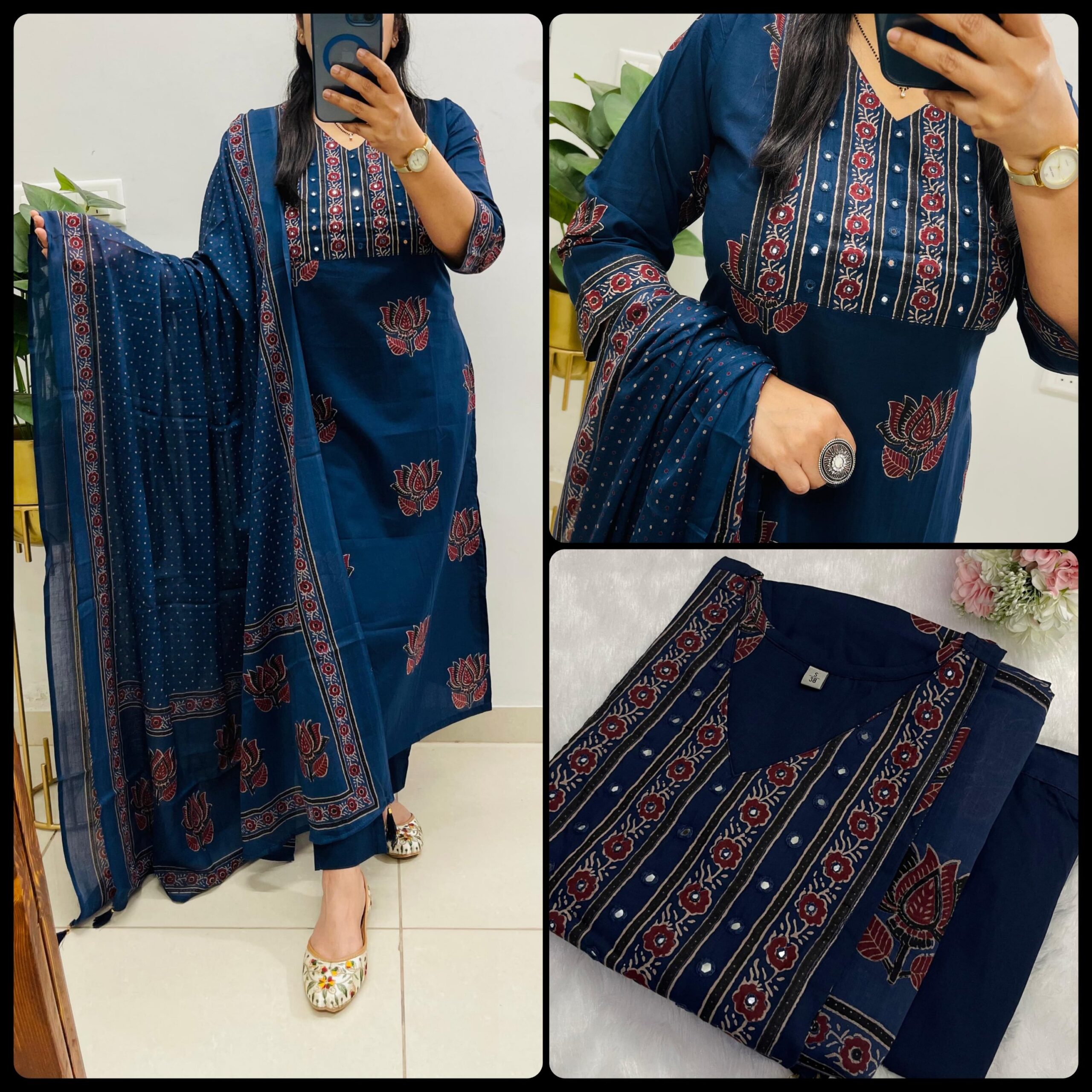 Designer Suit in Paisely/Azrak /Mughal/Kalamkari Fusion Azrak bagru print kurti pant dupatta set *Premium fine cotton* with handcrafted work on yoke paired with fine cotton dupatta with *tassels on dupatta*….