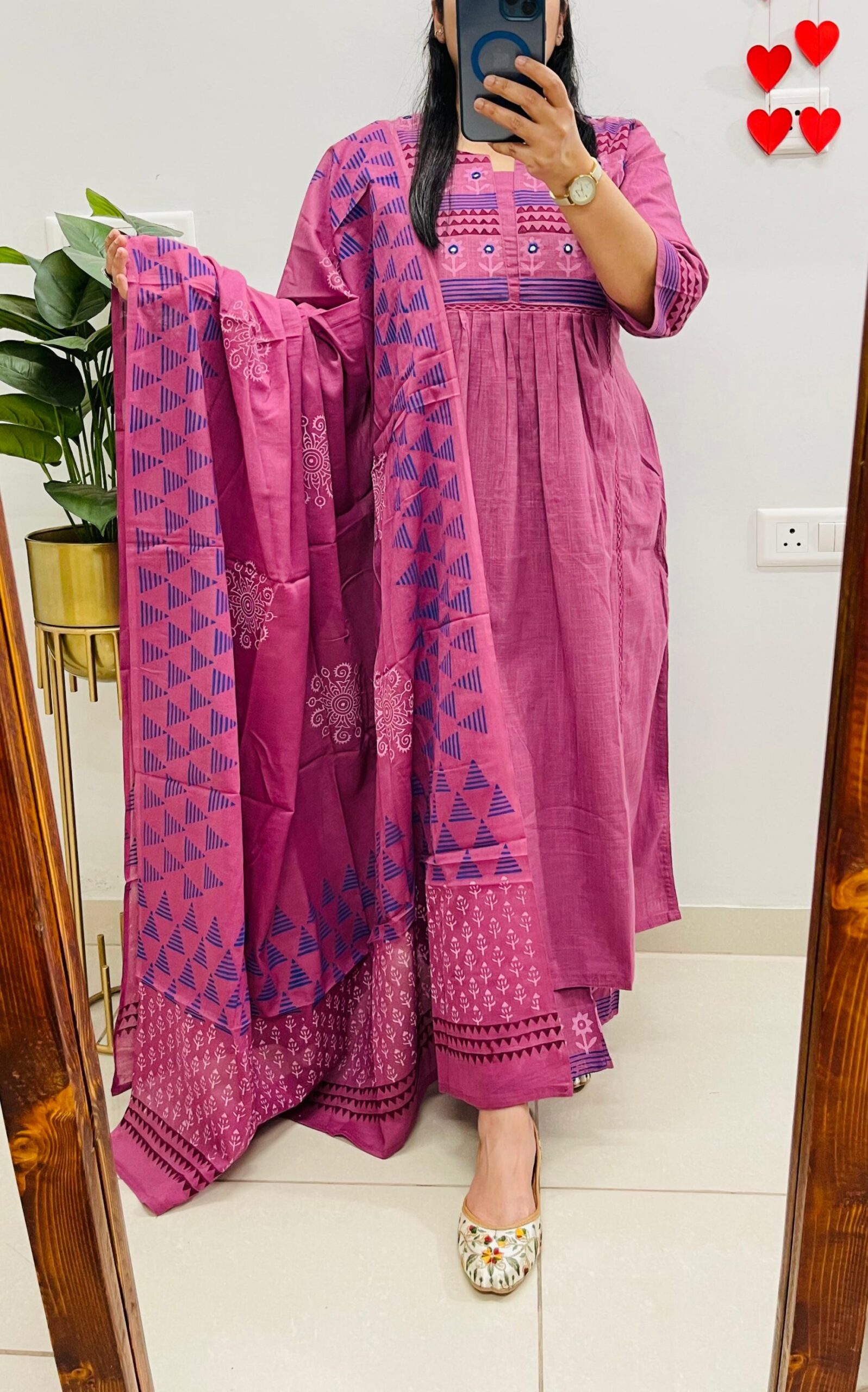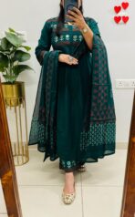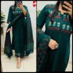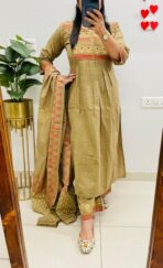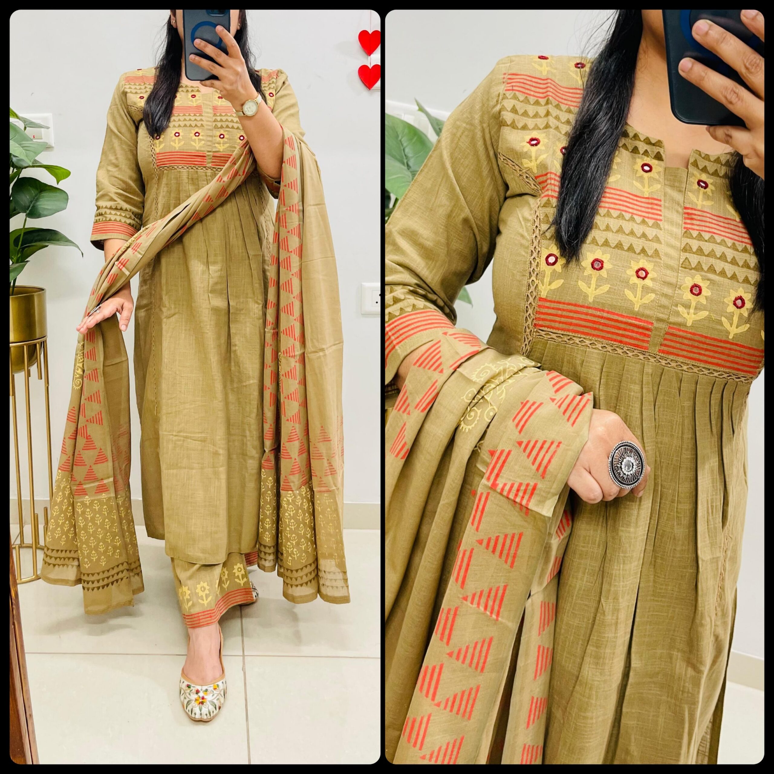 Designer Flared Suit in Slub Cotton fabric with paint prints & real mirror work in Princess Cut pattern with side slit… Semi plazo pants with cotton dupatta in pretty color combination…
