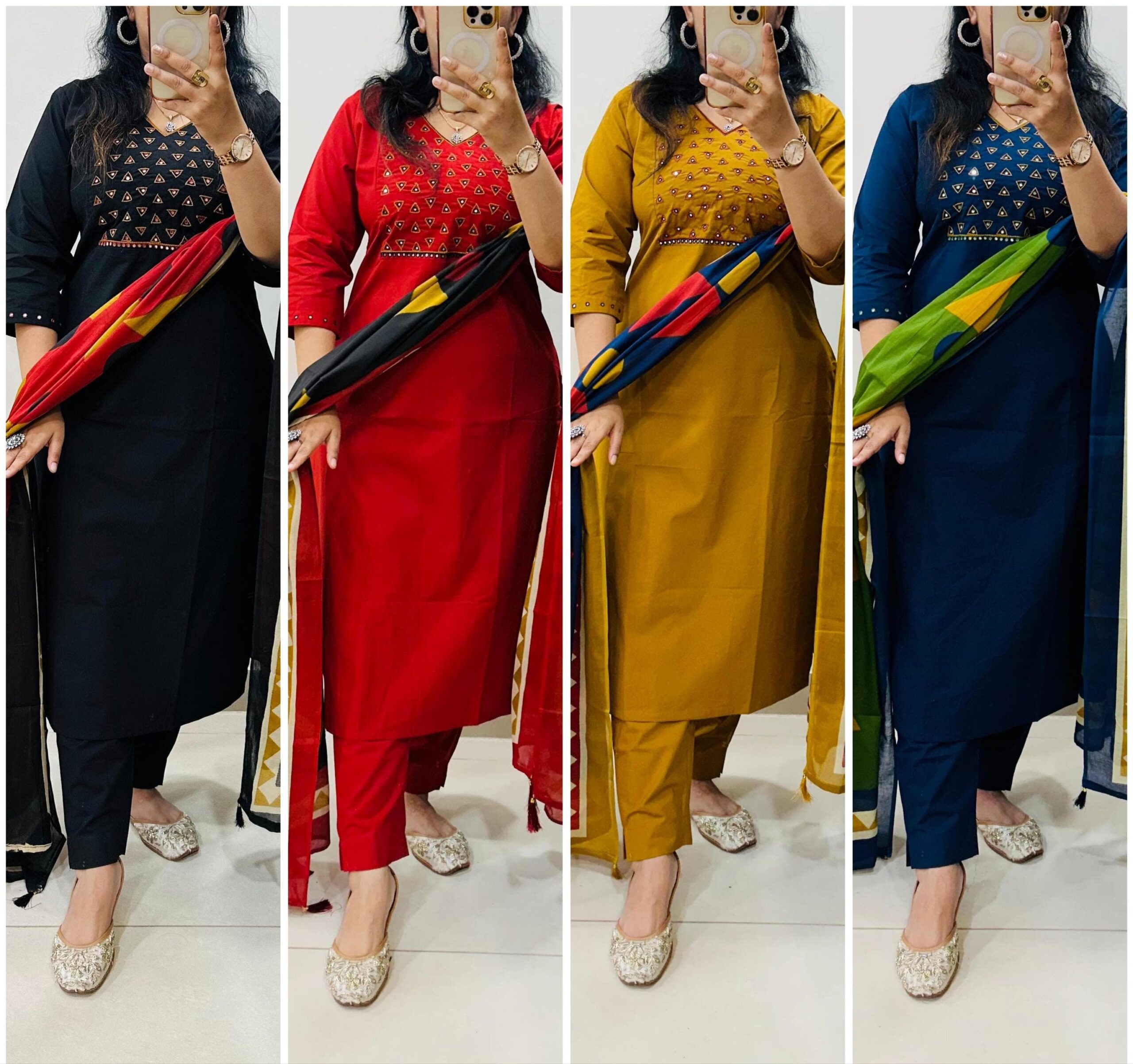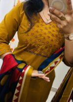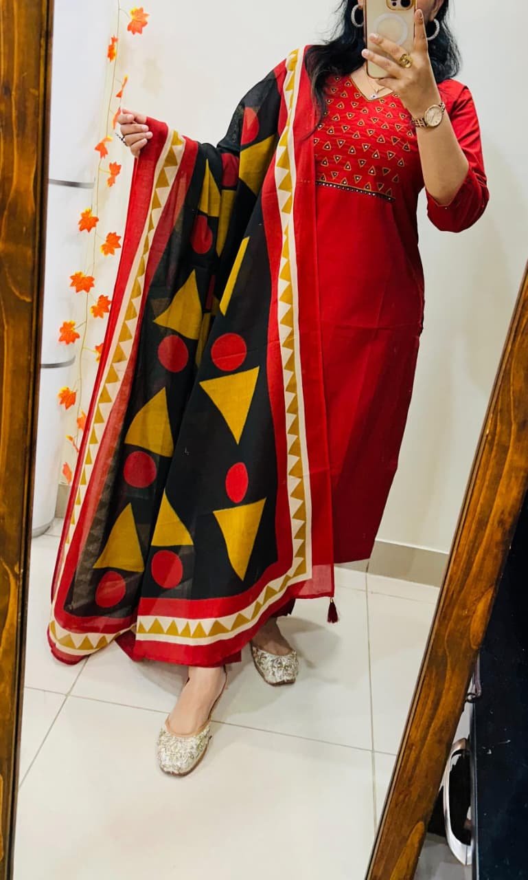 Stylish Ethnic Kurti Pant Set in Rich Cotton with Heavy Embroidery work in yoke sleeves and duppata with tussels