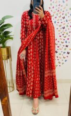 A unique blend of traditional patterns and beautiful details makes this anarkali suit set a must-have for any fashion-forward individual. With the intricate ikkat print, this set is guaranteed to make you stand out. Plus, the detailing work on the yoke part adds an extra touch of elegance.