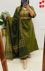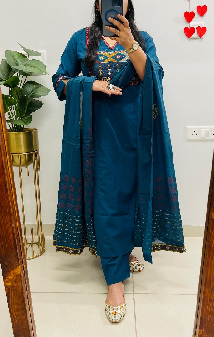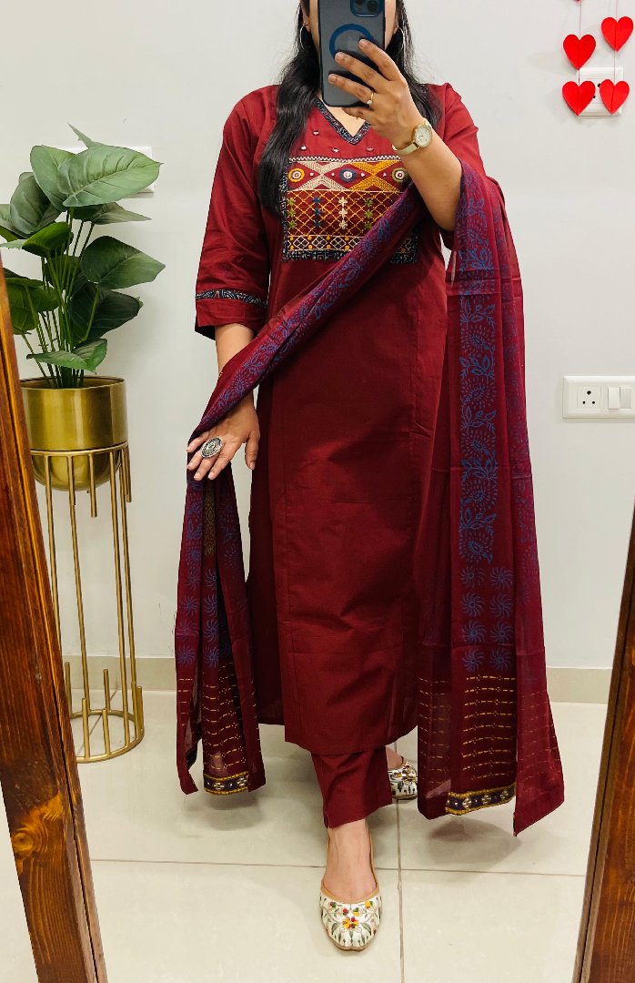 Stylish Ethnic Kurti Pant Dupatta Set in Rich Dhabu cotton fabric in V-neck Style with *heavy embroidery work on the yoke and pockets* with border detailing on dupatta & Sleeves…🌹🌹