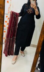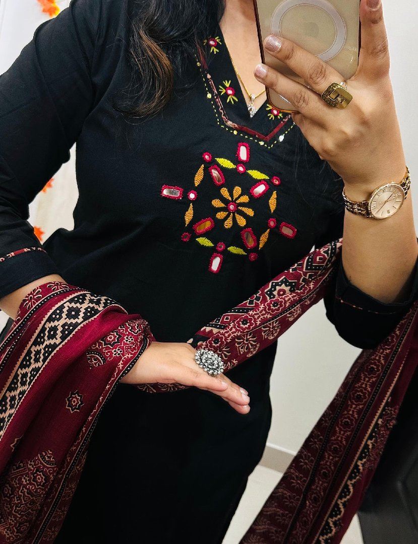 Beautiful kurti pant dupatta set in *Premium Dhabu Cotton* with heavy embroidery Mirror work in yoke and neckline with fine azrakh cotton dupatta