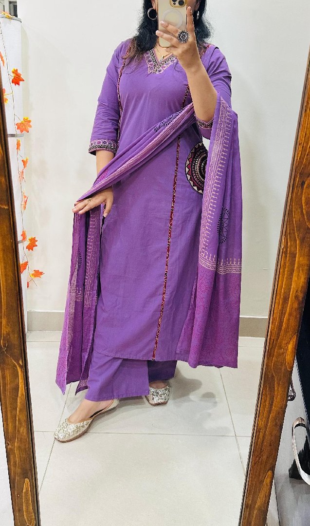 Premium Kurti Pant Dupatta Set in Rich Dhabu cotton fabric in V-neck Style with *heavy embroidery work on the yoke and pockets* with border detailing on Sleeves…🥳🥳