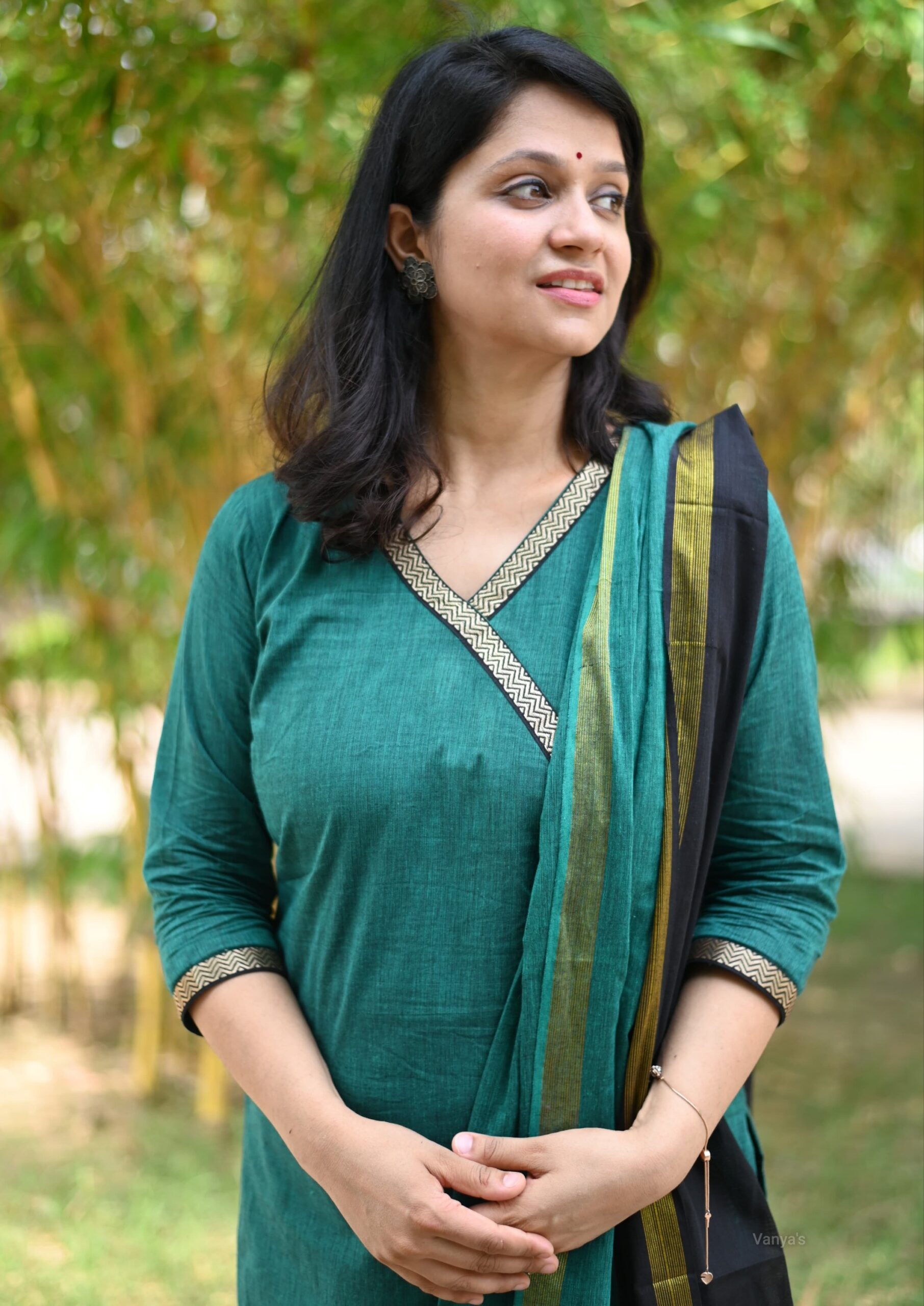 A sophisticated and traditional ensemble featuring south handloom cotton kurta, complemented by a vibrant black dupatta and matching same colour south cotton pant. The attire is an exquisite blend of cultural richness and contemporary style.