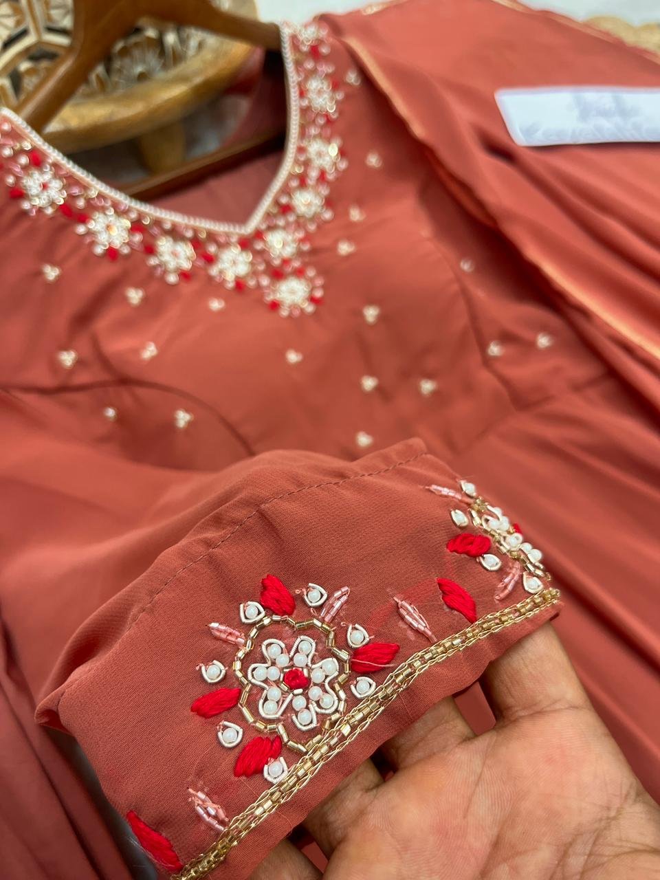 *Work:* Heavy Neck Embroidery with Moti (Pearl) Work & Sleeves Embroidery