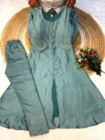 Crafted in luxurious blooming vichitra silk, this elegant A-line kurta set is adorned with beautiful sleeve and pant handwork this work highlight rich look of the outfit.This fabric is very soft and shiny.this is perfect for all kind of upcoming occasion🥰